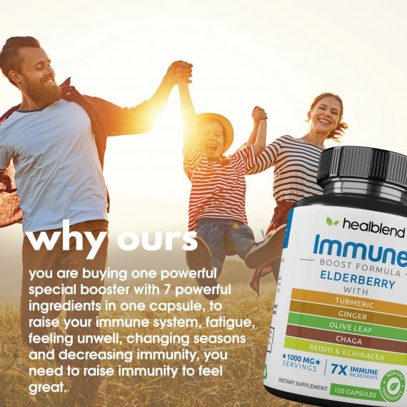 Elderberry with Olive Leaf, Chamomile, Ginger, Chaga, and Turmeric Blend Immune Support Elderberry is available in tablet form. It is Healblend’s Immune System Booster Supplement in vegetarian capsule form.